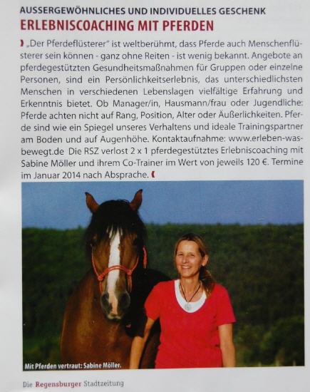 Die Mittelbayerische Zeitung berichtet: "Sabine Möller bietet ein Coaching mit Pferden an. In den Übungen mit dem Tier können Teilnehmer ihre Persönlichkeit stärken sowie Achtsamkeit trainieren und Stress abbauen." Mehr lesen...