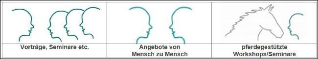 Anhand dieser drei Logos sehen Sie bei jedem unten stehenden Termineintrag um welchen Bereich es sich handelt: - Ein Seminar oder Vortrag für eine Gruppe von Menschen ohne Einbindung des Pferdes. - Ein Einzelangebot für das Coaching von Mensch zu Mensch oder - ein Angebot für Einzelpersonen oder Gruppen mit Einbindung des Pferdes.